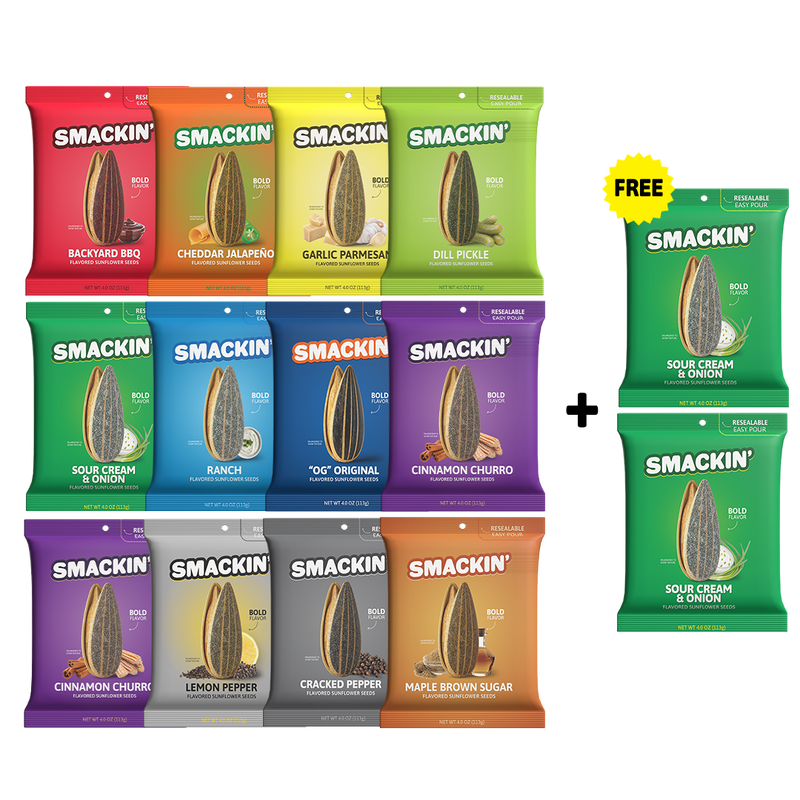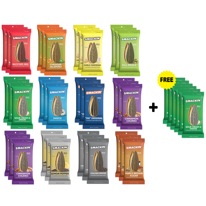 True sunflower seed enthusiasts can attest to their love for seeds and SmackinSunflowerSeeds products. Our Big Savings Bundle is a dream come true. This colossal collection includes all the goodies you love, but in greater quantities and at an insane value. We included all of our bestselling flavors, plus two bonus large bags of our famed sour cream and onion, because we know how much of a crowd pleaser it is.